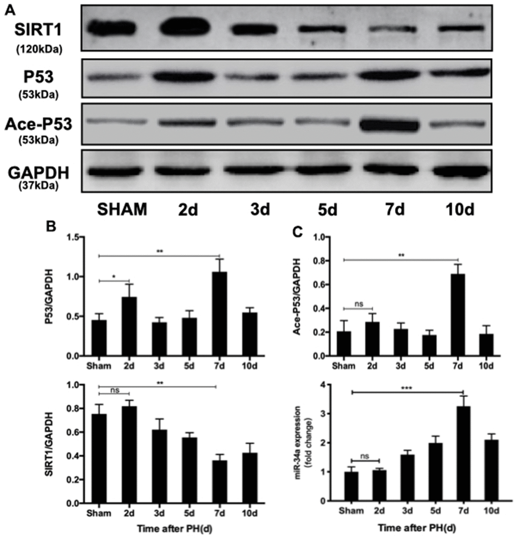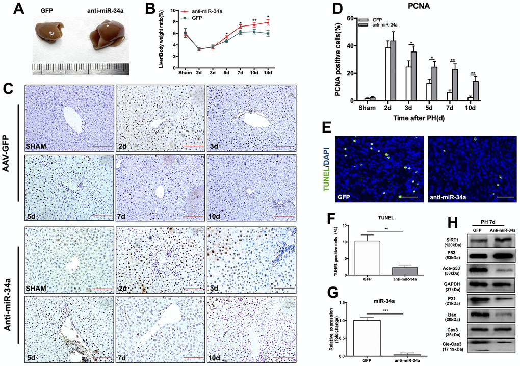 Mice were divided into the following groups at random: Ade-GFP group: mice transfected with adenovirus carrying GFP. Ade-p53 group: mice transfected with adenovirus carrying P53; AAV8-GFP: mice transfected with AAV8 carrying GFP; AAV-anti-miR-34a group: mice transfected with AAV8 knockdown of miR-34a. Mice ether received sham or PH surgery (sham, n = 9; PH, n = 9 per time point).