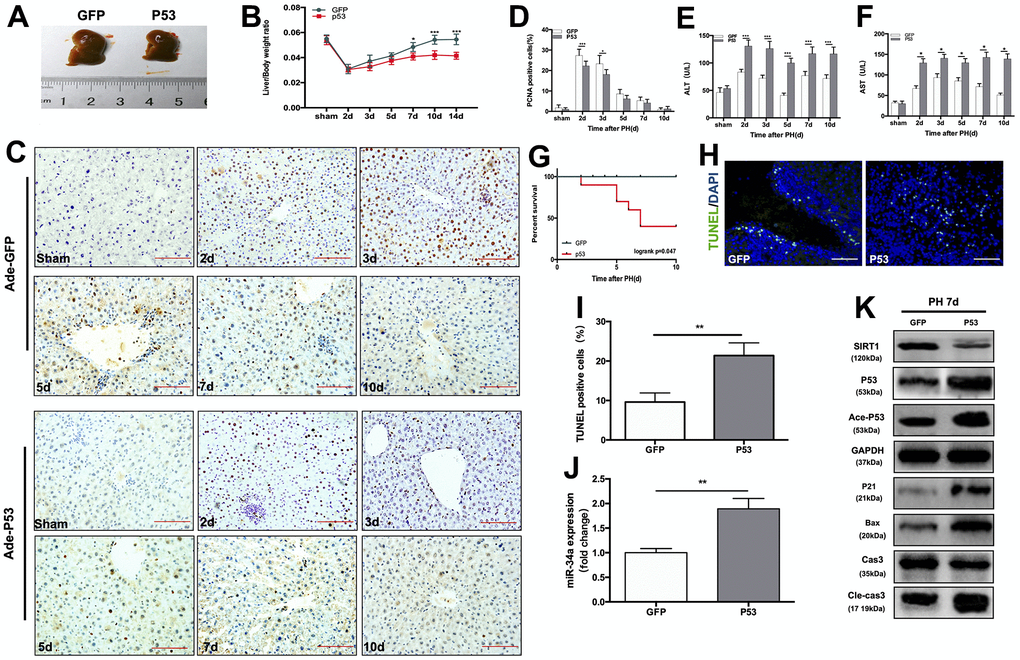 In order to further study the role of the P53/miR-34a/SIRT1 loop in LR, we performed PH on mice that received tail-vein injection of adenovirus overexpressing P53 (Supplementary Figure 1). When compared to the size of regenerated livers in mice from the Ade-GFP group, mice from the Ade-P53 group had significantly smaller regenerated liver size (Figure 2A). The liver-to-body weight ratio at day 7, day 10 and day 14 was significantly lower in the Ade-P53 group, and the liver-to-body weight ratio stopped increasing starting on day 5 in the Ade-P53 group (Figure 2B). Then, we compared the proliferation of cells in the liver during LR, and we observed more PCNA-positive cells in the Ade-GFP group on day 2 and 3 after PH (Figure 2C, 2D). The levels of ALT and AST in the Ade-GFP group spiked soon after surgery, then steadily reduced as the liver mass and physiological structures started to recover. In Ade-P53 mice, however, the serum levels of ALT and AST were considerably higher and did not return to normal when compared to GFP mice (Figure 2E, 2F). The survival rate of mice that received PH surgery decreased sharply to 50% in the Ade-P53 group (Figure 2G). TUNEL-positive cells in liver increased in P53 group (Figure 2H, 2I). When P53 was overexpressed, the P53/miR-34a/SIRT1 loop expression was enhanced at 7 days after PH (Figure 2J, 2K). Therefore, these data suggest that knock-in of P53 enhanced P53/miR-34a/SIRT1 positive feedback loop during LR and terminates LR early.