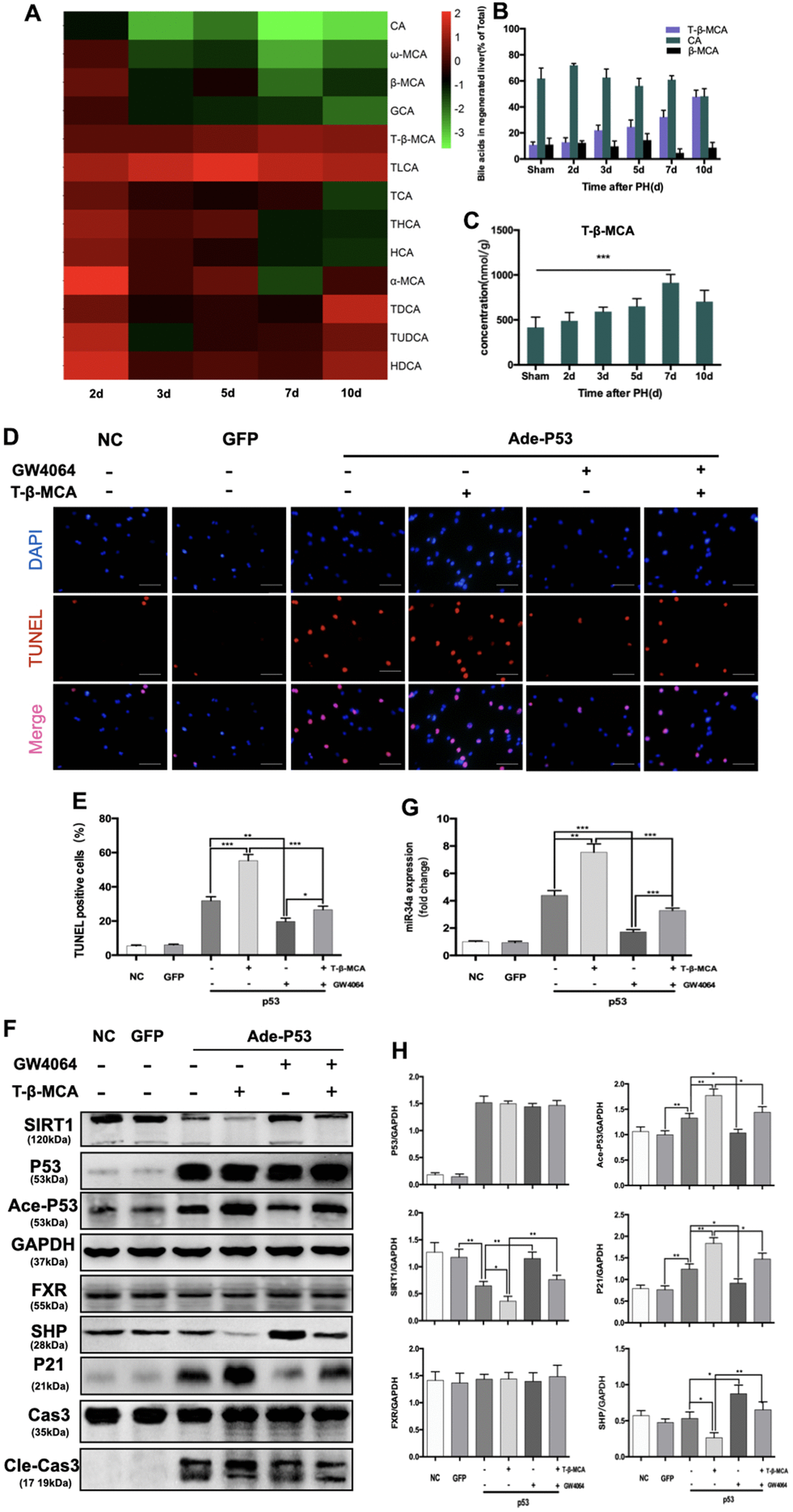 In our study, we found that total BA levels were in the early phase of LR and lower in the termination stage of LR, with a gradual increase in the proportion of T-β-MCA over total BA (Figure 4B, 4C). Sama I. Sayin et al. identified T-β-MCA as a FXR antagonista, which suppressed the FXR/SHP pathway [22]. Our study showed that T-β-MCA suppressed the FXR/SHP signaling pathway and amplified the proapoptotic effects of P53-induced activation of the P53/miR-34a/SIRT1 positive feedback loop both in vitro and in vivo.