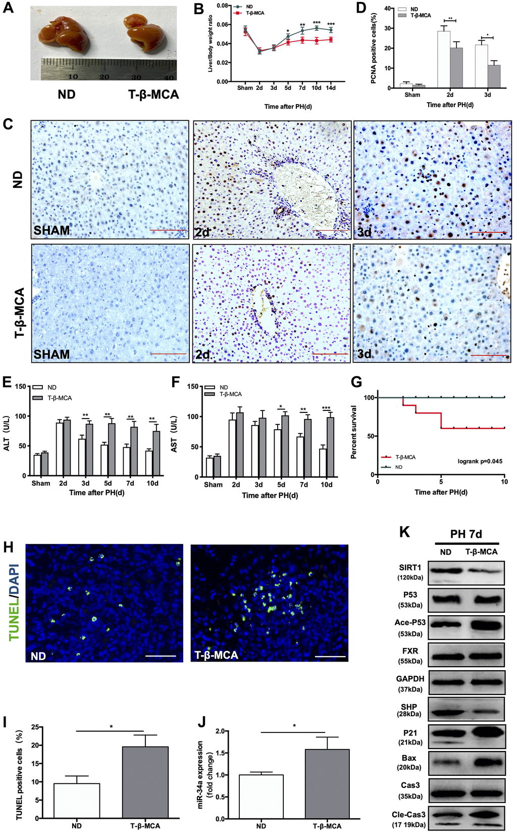 We next performed PH on mice fed a normal diet (ND) and mice fed extra T-β-MCA in sterile water by gavage. At 7 days after PH, the size of regenerated livers in the T-β-MCA group was considerably smaller than that in ND group. (Figure 5A). The liver-to-body weight ratio at days 5, 7, 10 and 14 after PH was significantly lower in the T-β-MCA group (Figure 5B). PCNA staining showed that cell proliferation was suppressed in the T-β-MCA group (Figure 5C, 5D). However, the levels of ALT and AST in mice serum were significantly higher and did not recover to normal in T-β-MCA mice compared with ND mice (Figure 5E, 5F). The survival rate of mice that received PH surgery decreased sharply to 50% in the Ade-P53 group (Figure 5G). TUNEL-positive cells in liver increased in T-β-MCA group (Figure 5H, 5I). WB showed that the effect of the P53/miR-34a/SIRT1 positive feedback loop increased, while FXR/SHP was inhibited in the T-β-MCA group (Figure 5J, 5K). Therefore, these data suggest that T-β-MCA is able to facilitate the proapoptotic effect of the P53-activated P53/miR-34a/SIRT1 positive feedback loop by suppression of the FXR/SHP pathway and terminate LR early in vivo.
