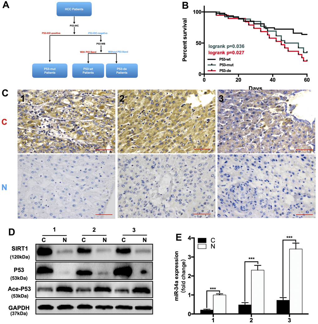 First, we divided 92 HCC patients based on P53-IHC staining into P53-mutated and P53-undetected groups. If the IHC of P53 was positive, the patient was classified as P53-mutated (P53-mut). Then, we divided the P53-negative patients classified by IHC into P53-deficient and P53-wild-type (P53-wt) through WB (Figure 6A). If there was a band in WB, the patient was classified in the P53-wild-type group (P53-wt). If there were no bands in WB, the patient was classified in the P53-deficient group (P53-de). The patient data are shown in (Table 1). We compared the expression of related gene in P53/miR-34a/SIRT1 positive feedback loop in liver cancer tissue(C) and adjacent normal liver tissue(N). When compared with P53-wt patients, P53-mut and P53-de patients has larger tumor size, and P53-mut and P53-de patients are more likely to have distant metastasis. We found that the 5-year survival of P53-deficient (P53-de) patients was the worst among patients from all 3 groups (Figure 6B). In P53-mut patients, IHC staining of P53 was positive, while the P53/miR-34a/SIRT1 positive feedback loop was absent in tumor tissue (Figure 6C–6E). In P53-de patients, IHC staining of P53 was negative, and the P53/miR-34a/SIRT1 positive feedback loop was absent in tumor tissue as well (Figure 6F–6H). In P53-wt patients, IHC staining of P53 was negative as well, while the P53/miR-34a/SIRT1 positive feedback loop was activated in tumor tissue (Figure 6I–6K).