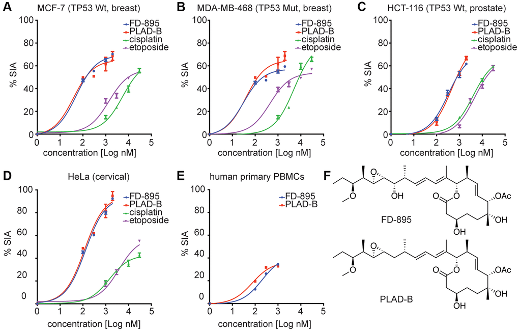 Interestingly, FD-895 and pladienolide B spares and normal cell inducing PBMCs (include T cells, B cells, and NK cells, monocytes, and dendritic cells), suggesting that these compounds have a preference to induce in vitro cytotoxicity preferentially in cancer cells and this creates a beneficial therapeutic window for patient treatment. These findings were in concordance with our previous observations in normal B cells [30]. We also tested the normal cell line HEK-293 in response to FD-895 and found no significant cell death, which was different to the cytotoxicity induced by cisplatin. These data further corroborated our observation that SPLMs induce prudentially apoptosis in tumor cell lines, but not in normal cells [57, 58].