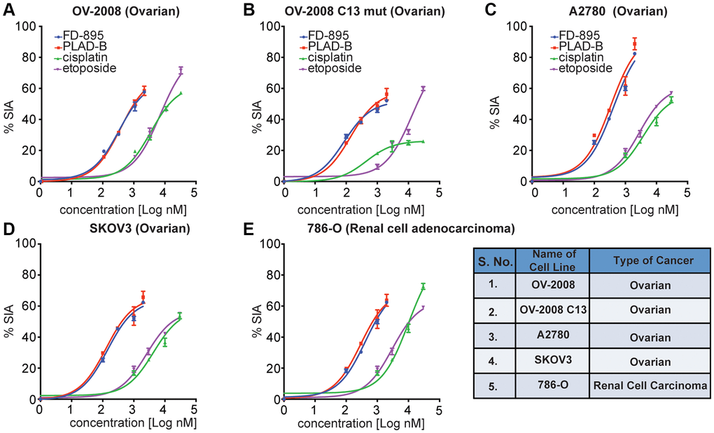 Next, we turned our attention to explore the activity of splice modulation on cell lines displaying sensitivity or resistance to cisplatin, as the latter is an issue in the treatment of solid tumors including ovarian [38], cervical cancer [39], gastric adenocarcinoma [40], prostate cancer [41], colorectal [42], and head and neck squamous cell carcinoma [43]. Here, we used two human ovarian cancer cell lines, one consisting of a cisplatin-sensitive parental line, OV2008, and the other stably cisplatin-resistant subline, OV2008/C13 derived by in vitro selection with cisplatin. We began by screening these cell lines for their induction of apoptosis when treated with FD-895, pladienolide B, cisplatin, or etoposide. FD-895 and pladienolide B induced significant apoptosis in both parental and cisplatin-resistant OV2008 cells (Figure 2A, 2B). We also observed that FD-895 and pladienolide B demonstrated significant apoptosis in A2780 and SKOV3 ovarian cancer cell lines as compared to cisplatin and etoposide (Figure 2C, 2D). These findings suggest that nanomolar concentrations of SPLMs have the potential to overcome cisplatin resistance. We also evaluated the apoptotic activity of FD-895 and pladienolide B in 786-O (renal) cancer cells. We found that both splice modulators were ten-fold more efficient at induced apoptosis than cisplatin and etoposide (Figure 2E).