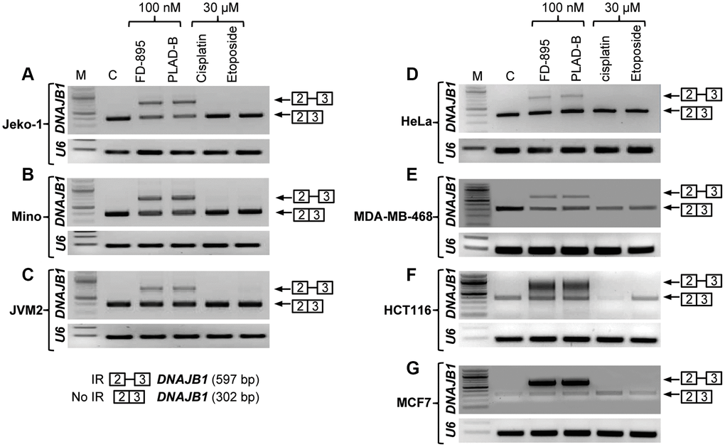 In previous studies, we found that FD-895 and pladienolide B induced IR in CLL and MCL cells [30–32]. Here, we expand our understanding of their ability to induce IR across an expanded panel of cancer cell lines, including Jeko-1, Mino, JVM2, HeLa, HCT116, MCF-7, and MDA-MB-468 cell lines. In brief, we incubated 106 cells/well from each cell line with a 100 nM FD-895, 100 nM pladienolide B, 30 μM cisplatin or 30 μM etoposide for 4 h. After treatment, the levels of spliced and unspliced gene expression were evaluated by RT-PCR. We observed that cells treated with FD-895 or pladienolide B demonstrated IR, which was not observed with non-splice modulatory controls, cisplatin, or etoposide (Figure 3) using DNAJB1 (DnaJ Heat Shock Protein Family (Hsp40) Member B1) as a surrogate marker for spliceosome modulation [30]. IR was observed in cells treated with FD-895 or pladienolide B for DNAJB1 when compared to the intronless gene RNU6A used as a loading control RNA (Figure 3A–3G).