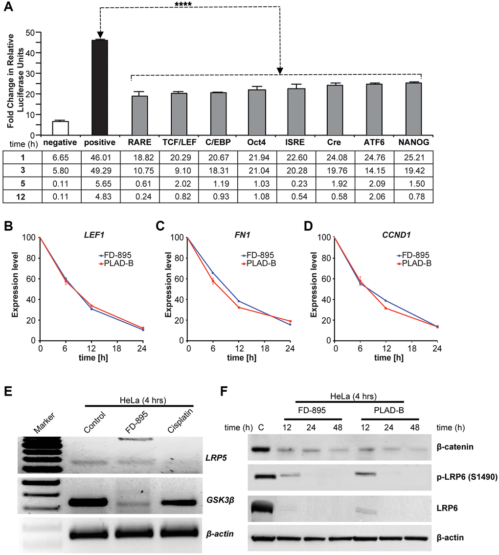 Among these pathways, we found that the Wnt signaling pathway was activated at an early time point but downregulated as the duration of FD-895 prolonged, as monitored by the TCF/LEF reporter in cervical cancer cell line HeLa (Figure 4A).