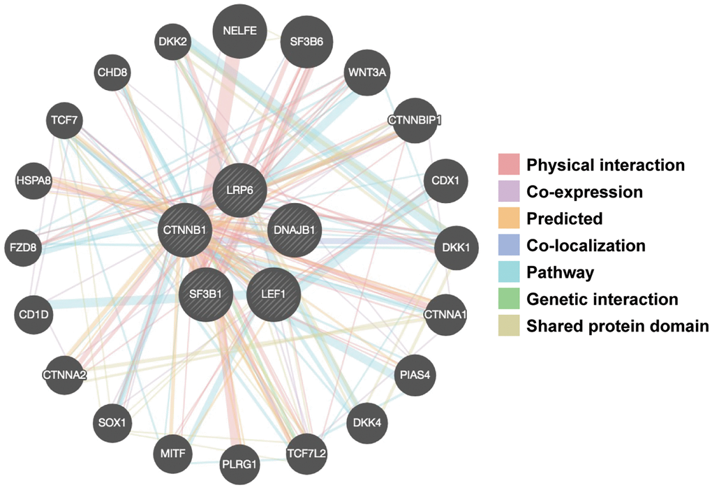 We obtained total twenty genes from GeneMANIA analysis and among those top ten interactor molecule emerge in the network were based on the size of the circle including NELFE (negative elongation factor complex member E, rank-1), SF3B6 (splicing factor 3b subunit 6, rank-2), Wnt3A (Wnt family member 3A, rank-3), CTNNBIP1 (catenin beta interacting protein 1, rank-4), CDX1 (caudal type homeobox 1, rank-5), DKK1 (dickkopf Wnt signaling pathway inhibitor 1, rank-6), CTNNA1 (catenin alpha 1, rank-7), PIAS4 (protein inhibitor of activated STAT 4, rank-8), DKK4 (dickkopf Wnt signaling pathway inhibitor 4, rank-9), and TCF7L2 (transcription factor 7 like 2, rank-10). Among these genes few genes are involved in Wnt signaling such as Wnt3A, CTNNA1, DKK4, and TCF7L2 suggest that there is an important role of RNA splicing machinery in regulation of Wnt signaling pathway.