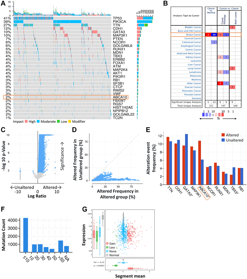 First, we obtained the mutation profiles of BRCA patients from the TCGA database. The details of the top 30 most frequently mutated genes are shown in the waterfall diagram as shown in Figure 1A. The validation of the TCGA-BRCA cohort indicates that ABCA10 is one of the frequently mutated genes. After analysis through the ONCOMINE database, we found that ABCA10 levels were much lower than normal tissues only in breast cancer among the pan-cancers (Figure 1B). Analysis of the frequency of concurrent gene alterations with ABCA10 gene alterations by the cBioPortal database revealed a total of 9083 genes with concurrent gene alterations, which were enriched for both ABCA10 altered and unaltered cohorts (Figure 1C, 1D). However, TTN, CDH1, GATA3, MAP3K1, ABCA10, NCOR1, RUNX1, MDN1 TBX3, RB1 altered and non-altered were the most common mutation cohort of genes altered (Figure 1E). We assessed the mutation load of each type of breast cancer by counting the mutations in each tumor sample. Most breast tumors had a mutation load in the <10 change range (Figure 1F). Significant changes in ABCA10 gain and loss were observed in the CNV ratio distribution and box plot (Figure 1G).