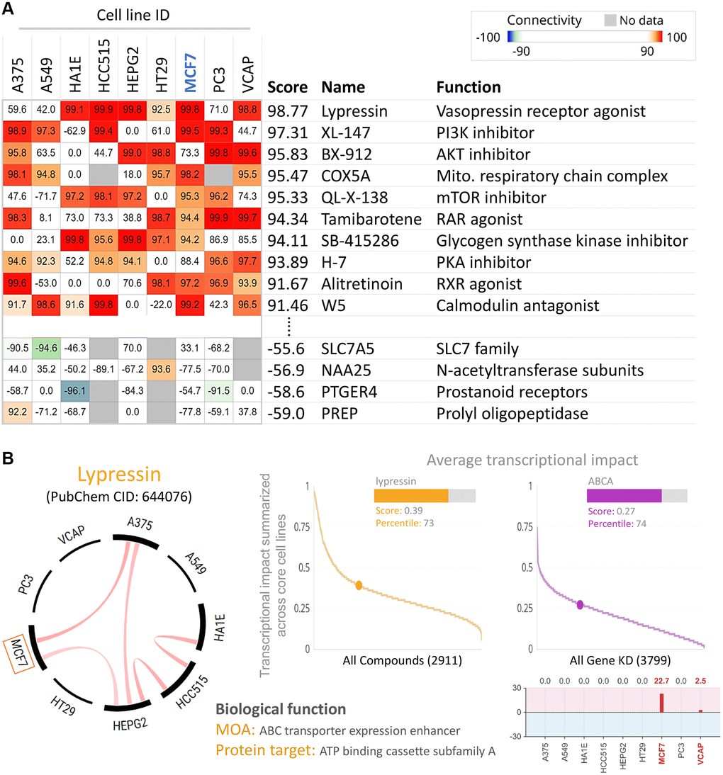 To find potential drugs targeted at ABCA10, we used connectivity Map (CMap) analysis. The CMap database provides gene signatures and filters for associations between specificity and drug-driven gene expression. The heatmap in Figure 10A shows the top 10 perturbants that mimic the ABCA10-driven gene signature, including Lypressin with a score of 98.77 as a Vasopressin receptor agonist, which regulates ABCA10 in MCF7 cells. In contrast, CAY-40145 was also a regulator of ABCA10 in MCF7 cells. As shown in Figure 10B, we found that the scores of Lypressin and ABCA10 KD on breast cancer cells (MCF7) were 0.39 and 0.27, respectively, indicating a positive correlation between the average transcriptional effect of ABCA10 expression and Lypressin drug activity. Thus, Lypressin treatment could mimic the gene expression profile of ABCA10 restoration.