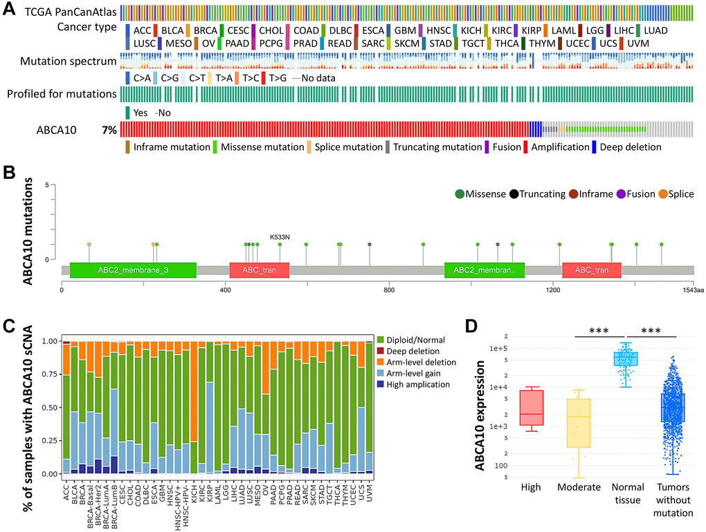 cBioPortal (http://cis.hku.hk/TISIDB/) is a comprehensive website that allows exploration, visualization and analysis of multidimensional cancer genomic data [11]. We obtained the frequency of ABCA10 gene changes, mutation types and copy number changes in all tumors in TCGA through the "Cancer Type Summary" module of cBioPortal. In this study, we selected “TCGA Pan Cancer Atlas Study” in “Quick Select” section of the cBioPortal web and entered into “ABCA10” to find the genetic alteration characteristics of ABCA10. Next, we observed the alteration frequency results, structural variants, mutation type, and CNA (Copy number alteration) of all TCGA tumors within the “Cancer Types Summary” module.