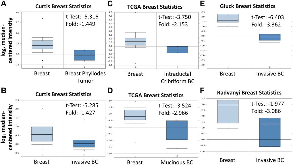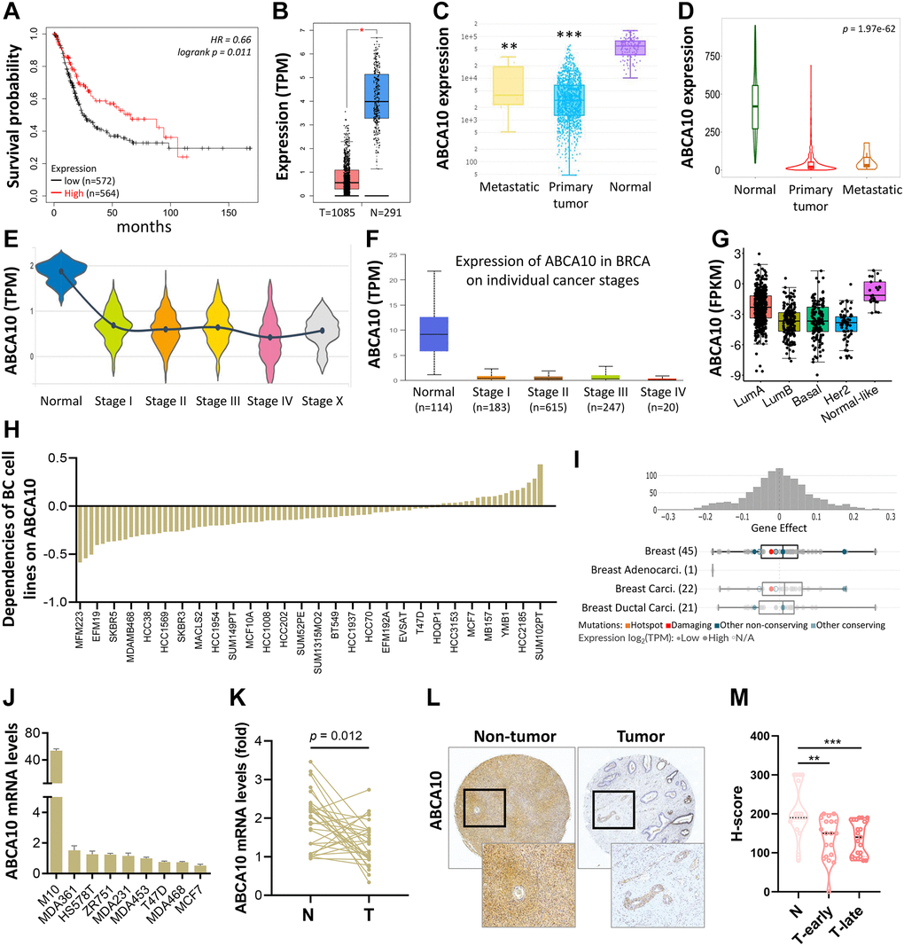 As shown in Figure 3A, BRCA patients were divided into low ABCA10 and high ABCA10 groups using the median expression as the threshold, and the expression difference between the two groups was significant (p = 0.011). Kaplan-Meier analysis showed that the survival rate of the low-ABCA10 group was shorter than that of the high-ABCA10 group. We analyzed the expression levels of ABCA10 in normal and tumor tissues of the breast and showed a significant decrease in ABCA10 expression in tumor tissues (Figure 3B). The expression of ABCA10 in malignant breast cancer was shown by various databases, and the results showed that metastatic tissues were significantly lower than normal tissues (Figure 3C, 3D). To understand the levels of ABCA10 mRNA at different clinical stages, the data consistently showed that the levels of ABCA10 were significantly reduced from stage I (Figure 3E, 3F). The expression levels of ABCA10 in luminal A, luminal B, basal-like, and HER2 were all lower than normal tissues in different subtypes of breast cancer (Figure 3G). We further analyzed the dependence of 84 breast cancer cell lines on ABCA10 and mapped the ABCA10 dependence (fold change in sgRNA abundance relative to control transfected cells) of breast cancer cell lines and different subtypes, which were ranked by increasing ABCA10 dependence (Figure 3H, 3I). We further confirmed the mRNA levels of ABCA10 in breast cancer cells and normal breast cells (H-184B5F5/M10), and the results were consistent with the database data, where ABCA10 levels were significantly higher in normal breast cells than in other breast cancer cells (Figure 3J). Next, we examined the mRNA expression of ABCA10 in 30 paired BRCA and non-tumor tissues. The qPCR results showed that ABCA10 was significantly up-regulated in BRCA tissues (Figure 3K). To further confirm the accuracy of the multi-omics analysis, we evaluated ABCA10 detected using immunohistochemistry in tumor tissues using 60 BRCA commercial tissue microarray (TMA). The results of ABCA10 expression in BRCA tissues in IHC staining are shown in Figure 3L. The IHC score of ABCA10 decreased significantly from early stages and decreased significantly with the increase of late stages (Figure 3M). The results were consistent with the results of the Oncomine database, and where lower ABCA10 expression levels occurred at an early stage. Using the Oncomine dataset, we analyzed the levels of ABCA10 in normal breast tissue, breast phyllodes tumor, Intraductal Cribriform breast cancer, mucinous breast cancer, Invasive breast cancer, and other breast cancers. breast cancer. The expression of ABCA10 mRNA in BRCA was significantly lower than normal samples from all four datasets, and the sample size and fold changes corresponding to the four studies are summarized in Figure 4.