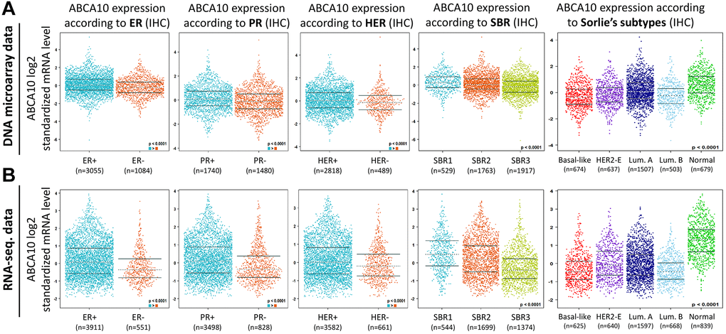 Both DNA microarray (Figure 5A) and RNA sequencing data (Figure 5B) confirmed consistent results for ABCA10 levels in ER+, PR+, HER+, (ER+ > ER-, PR+ > PR-, HER+ > HER-; p < 0.0001) with high expression. Analysis according to the Scarff Bloom and Richardson equivalence state (SBR) criterion showed that increased SBR levels correlated significantly with decreased ABCA10 levels (SBR1 > SBR2 > SBR3, p < 0.0001) in both DNA microarray and RNA sequencing data. Subsequently, results in different breast cancer subtypes also showed higher expression of ABCA10 in normal tissues than in other subtypes. Taken together, these DNA and RNA results provide prognostic value for the clinicopathological parameters of breast cancer.