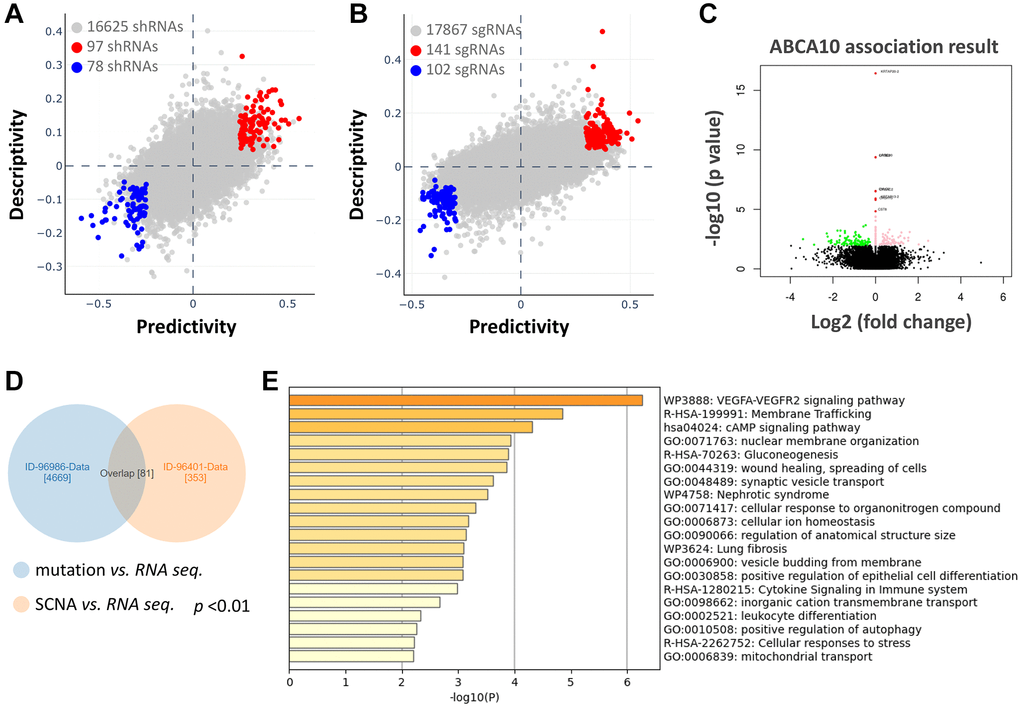 We further analyzed the association between shRNA/sgRNA efficacy and the expression levels of target genes in different breast cancer cell lines. We attempted to calculate two-way predictive and descriptive scores for each of the more than 16,000-17,000 genes using statistical tests (Figure 6A, 6B). Among the shRNA efficacy, 97 genes (red circles in Figure 6A) showed positive scores in predictiveness and descriptiveness, while 78 genes (blue circles in Figure 6A) showed negative scores. Similarly, among the sgRNA efficacy, 141 genes (red circles in Figure 6B) showed positive scores in terms of predictiveness and descriptiveness, while 102 genes (blue circles in Figure 6B) showed negative scores. To further explore the potential functions and molecular pathways of ABCA10 genes in BRCA, we identified ABCA10 co-expressed genes in the data of 975 patients from TCGA using the LinkedOmics database. A total of 7,966 ABCA10-associated genes were altered, reflecting the important impact of the core gene ABCA10 on the pathogenesis of BRCA. These clusters of genes positively associated with ABCA10 are shown as red dots, whereas the clusters of genes negatively associated with ABCA10 are indicated by green dots in the volcano plot (p < 0.01 and FDR <0.01, Figure 6C). The 80 overlapping genes were analyzed by combining the two databases, and the top 20 significant gene clusters associated with ABCA10 were shown by functional enrichment (Figure 6D, 6E).