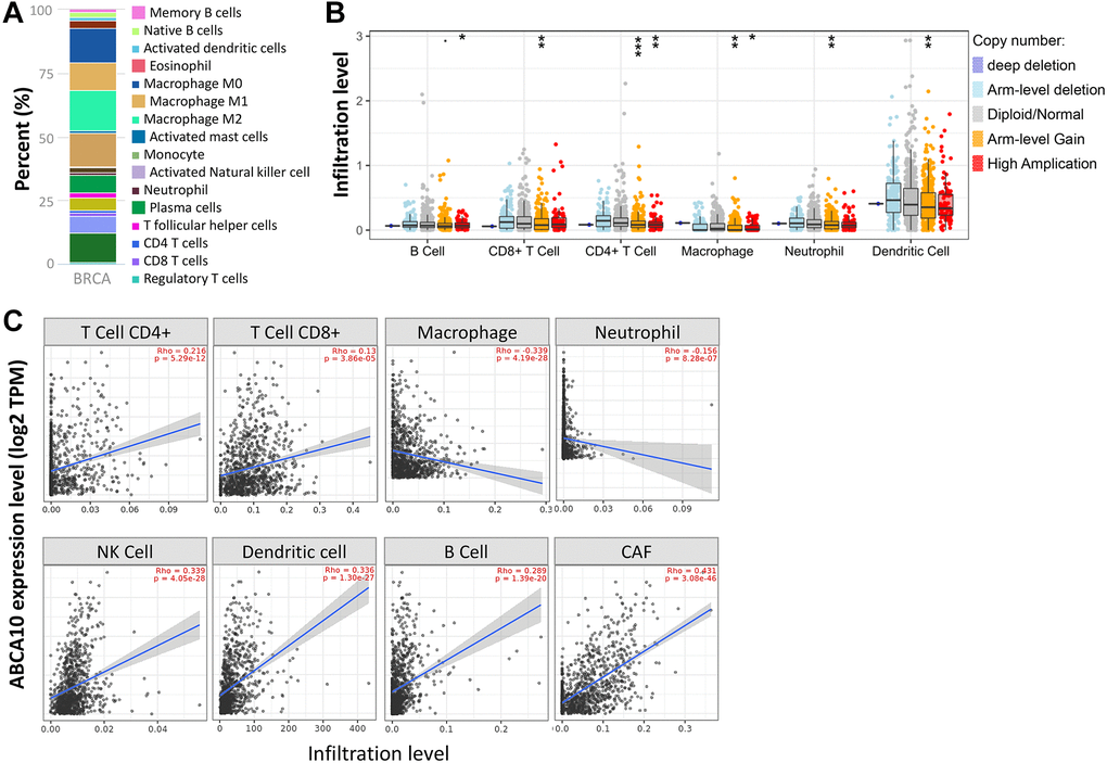 Tumor Immunology Estimation Resource (TIMER) 2.0 is providing a profile of various infiltrating immune cells (B cells, CD4+ T cells, CD8+ T cells, neutrophils, macrophages and dendritic cells...etc.) in tumor tissues as detected by RNA-Seq expression profiling data. We evaluated the association of ABCA10 expression levels with immune cell infiltration, survival of BRCA patients as derived from different databases in TIMER, and immune cell infiltration with genes. We entered "ABCA10" in the "Gene_DE" module of the TIMER 2.0 and found differences in ABCA10 expression between adjacent normal tissues and 33 different tumors or specific tumor subtypes in the TCGA project.