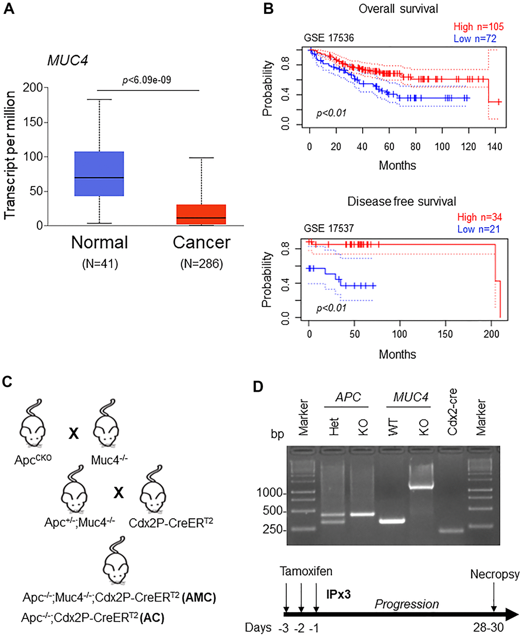Transmembrane mucin MUC4 is differentially expressed in various cancers. In early gastric cancer, expression of MUC4 was associated with lymphatic invasion, lymph node metastasis and predicted poor prognostic factors [30]. Further, the importance of MUC4 expression was identified in invasive ductal carcinoma (ICD) of the pancreas. The study concluded that in surgical resected IDC, MUC4 could serve as a valuable indicator to predict the outcome of patients [31]. Mechanistic studies suggest that the presence of MUC4 mediates pancreatic cancer cell invasion and metastasis by stabilizing fibroblast growth factor receptor 1 [32] and oncogenic signaling via interaction with HER3 [33]. Contrary, MUC4 has a tumor suppressor role in non-small-cell lung cancer by altering p53 expression [34]. Therefore, the present study focused on understanding the role of MUC4 in CRC progression and alteration of intestinal barrier function by developing a GEM model having an Apc mutation with or without Muc4 using colon-specific Cdx2-Cre mice. Previously, we showed that MUC4 expression is significantly downregulated in human CRC patient tissues compared to normal individuals [17]. Similarly, the TCGA-COAD database also showed that lowered expression of MUC4 in normal individuals is associated with poor survival. Therefore, we investigated the potential role of Muc4 in CRC by using a GEM model with an Apc mutational background.
