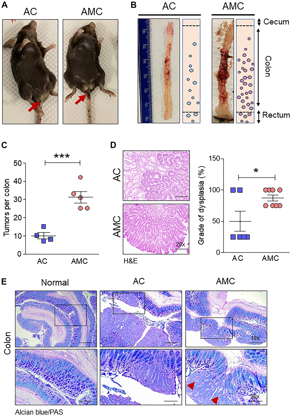 Colon tissue was harvested for AC and AMC mice between 25-35 and 5-25 days, respectively, after tamoxifen induction. The colon was open longitudinally, and fecal material was gently removed. After washing with phosphate-buffered saline (PBS), a Swiss roll of the colon was made. For histology, tissues were fixed with 10% neutral buffered formalin prior to paraffin embedding. Both AC and AMC colon tissues were stained with hematoxylin and eosin, and pictures were taken with Leica ICC50 E microscope (Buffalo Grove, IL). Histological examination of grade of dysplasia was determined by the pathologist. To stain mucins, deparaffinized mouse colon tissues were immersed in Alcian blue followed by Periodic acid-Schiff (PAS) staining.