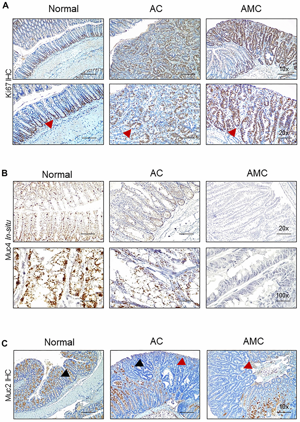 Next, we characterized goblet cell function in all animal groups by staining Swiss rolled colon tissues with Alcian blue (stains acidic mucins) and Periodic acid–Schiff (PAS, neutral mucins). We observed that in both AMC and AC mice, there was a complete absence or loss of staining in the goblet cells of colon adenoma (Figure 2E), suggesting that disruption of goblet cell function alters the mucin production. There was an increase in the crypt length of AMC mice associated with strong Ki67-positive staining in the proliferating epithelial cells in the colon with a disorganized pattern. In contrast, normal animals showed Ki67 staining mostly restricted at the bottom of the crypt, absent in the epithelial cells towards the top of the crypt (Figure 3A).