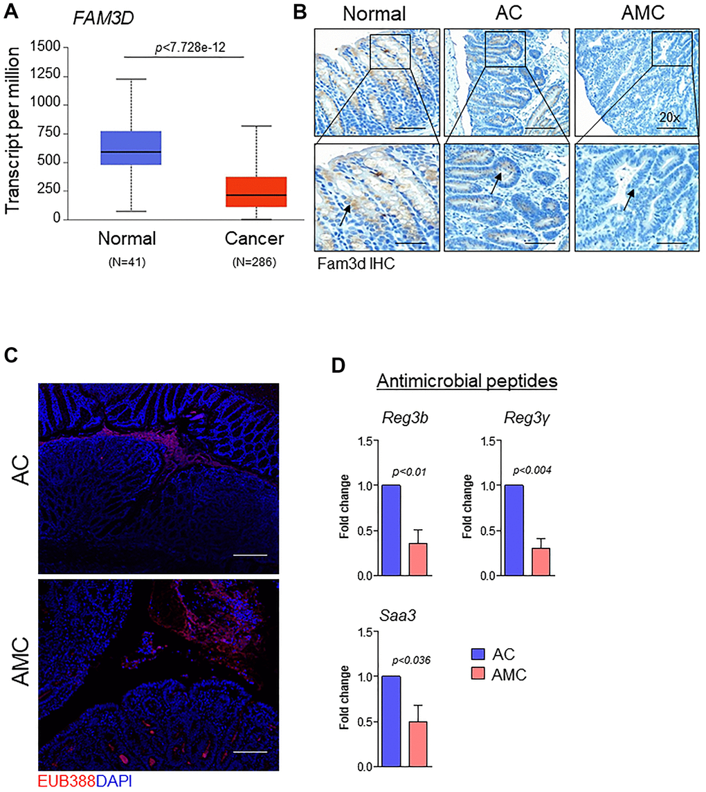 Like Muc2, the gut secreted protein Fam3d is essential for colon homeostasis [26]. Human FAM3 consists of four gene families: FAM3A, FAM3B, FAM3C, and FAM3D [26]. Among all FAM3 family members, the expression of FAM3D is significantly downregulated in human CRC patients compared to normal individuals (Figure 4A and Supplementary Figure 1B). Therefore, we examined the expression of Fam3d and observed that Fam3d was expressed in Muc2 positive goblet cells in the normal mice, while its expression was greatly diminished or lost in the adenoma region of AMC mice (Figure 4B), suggesting that loss of both Muc2 and Fam3d reduces intestinal mucus layer thickness in AMC animals. Both Muc2 and Fam3d have been involved in preventing the entry of bacteria maintaining the colon homeostasis, as evidenced in several studies [26, 27]. Therefore, we analyzed the colon tissue sections for bacterial invasion by FISH using a general 16S rRNA probe (EUB338). Compared to the AC, AMC mice colon had reduced mucus layer thickness, resulting in more bacteria infiltration in the colonic epithelial tissues (Figure 4C). Further studies are necessary to understand the various individual bacterial populations in the AMC model to determine the role of Muc4 in altering the gut microbiota. Next, we determined the expression of intestinal homeostatic antimicrobial peptides (Reg3b, Reg3γ, and Saa3) in colon of AMC and AC mice. Interestingly, we observed that the absence of Muc4 resulted in significant down regulation of these antimicrobial peptides at mRNA levels (Figure 4D). The absence of Muc4 in AMC mice resulted in severe bleeding in the large intestine (Figure 2A, 2B). To examine whether the bleeding recruits any cytokines and inflammatory cells, we analyzed the expression of proinflammatory cytokines such as Tnfa, IL-6, Cxcl2, Ccl2, Cxcl1 and IL-1 and observed that AMC animals showed up regulation of cytokines (Supplementary Figure 2A) whereas, no difference in the expression of F4/80 and CD3+ T cells staining in AMC and AC animals (Supplementary Figure 2B).