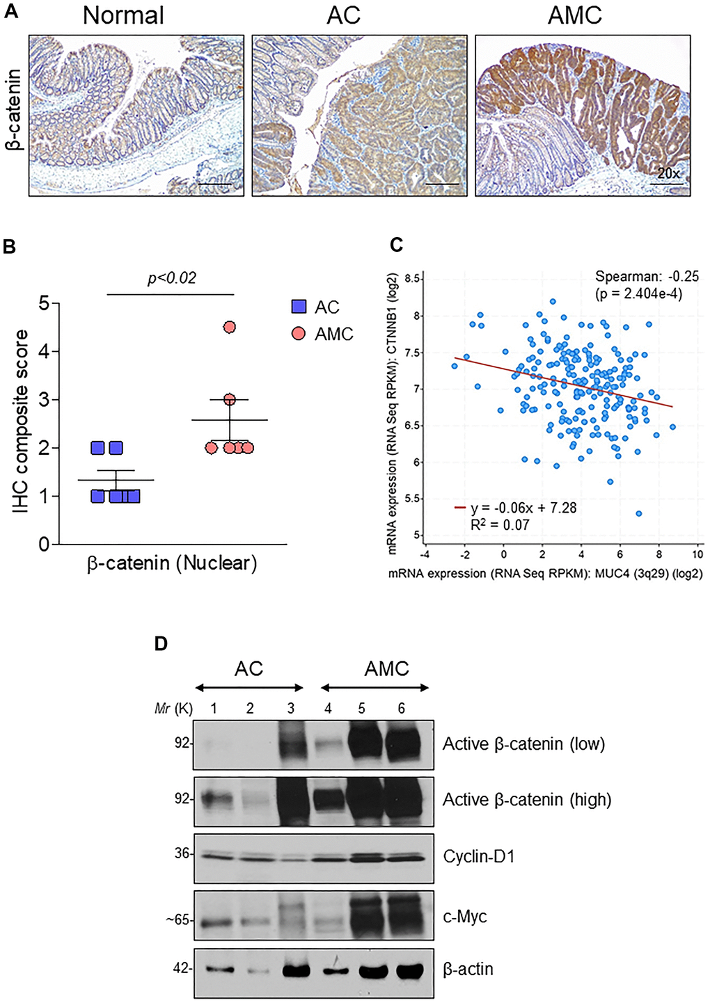 Wnt/β-catenin signaling plays an essential role in CRC progression. Around 90% of human CRC tumors contain mutations in the Wnt pathway, while 50-80% of CRC patients have an accumulation of β-catenin in the nucleus [28]. Therefore, we analyzed the expression of β-catenin in the nucleus by immunohistochemistry in both AMC and AC mice. Interestingly, AMC animals showed a significantly (p<0.02) higher nuclear accumulation of β-catenin compared to AC mice (Figure 5A, 5B). Similarly, we also identified a significant (p<2.404e-4) negative correlation between MUC4 and β-catenin in CRC patient dataset (Figure 5C). Further, mRNA and western blot analysis confirmed higher expression of β-catenin and its target molecules such as cyclin-D1, c-Myc, and CD44 in AMC mice (Supplementary Figure 3A and Figure 5D).