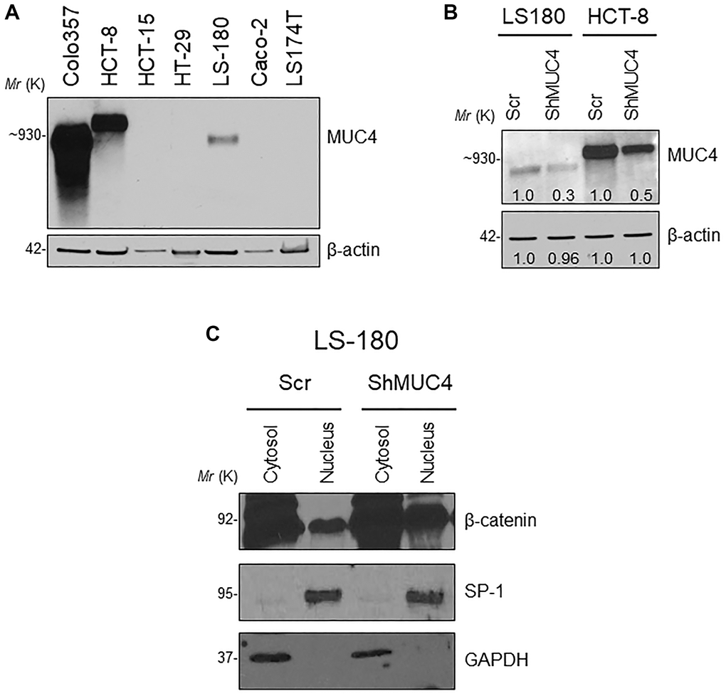 Next, we assessed the relationship between the MUC4 and β-catenin in the human CRC cell line. First, we screened a panel of CRC cell lines for MUC4 expression (Figure 6A) and other mucins such as MUC5AC, MUC1, MUC13 (Supplementary Figure 3B). The MUC4 expressing LS-180 and HCT-8 CRC cell lines were selected and then performed stable knockdown of MUC4 in both CRC cell lines (Figure 6B). Knockdown (KD) of MUC4 increased the expression of β-catenin, cyclin-D1, and CD44 at the transcript level in LS-180 and HCT-8 cells (Supplementary Figure 3C). Our cellular fractionation study also revealed that the MUC4-KD in the LS-180 cell line resulted in increased localization of β-catenin in the nucleus compared to a cytosolic fraction (Figure 6C). These data suggest that the presence of Muc4 prevents nuclear translocation of β-catenin in both in vitro and in vivo studies; however, further studies are needed to prove the molecular mechanism by which Muc4 modulates the Wnt/β-catenin signaling pathway(s).