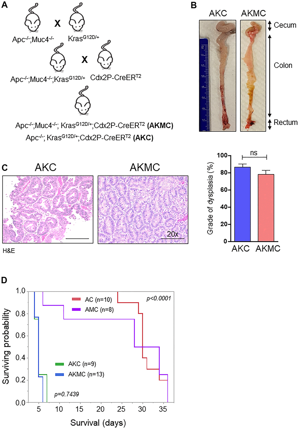 Early CRC tumors typically possess 30-50% activation mutations in the Kras (45%) gene along with Apc mutations [3]. Hence, to understand the significance of Kras mutations in CRC, we crossed LSL-Kras mice [B6.129-Krastm4Tyj (01XJ6) from NCI Mouse Models of Human Cancers Consortium, Frederick, MD, USA] [29] with AMC and generated Apc-/-;KrasG12D/+;Muc4-/-; Cdx2P-creERT2 (referred as AKMC) and its littermate controls Apc-/-; KrasG12D/+;Cdx2P-creERT2 (AKC) (Figure 7A). The activation of cre-recombination was carried out as described in Figure 1D. Interestingly, additional kras mutation in AKMC mice did not observe any macroscopic tumors in the colon (Figure 7B). However, tumor histology of the colon reveals both AKMC and AKC animals had low-grade dysplastic (Figure 7C). Further, these animals had a shorter life span than AMC and AC mice (Figure 7D).