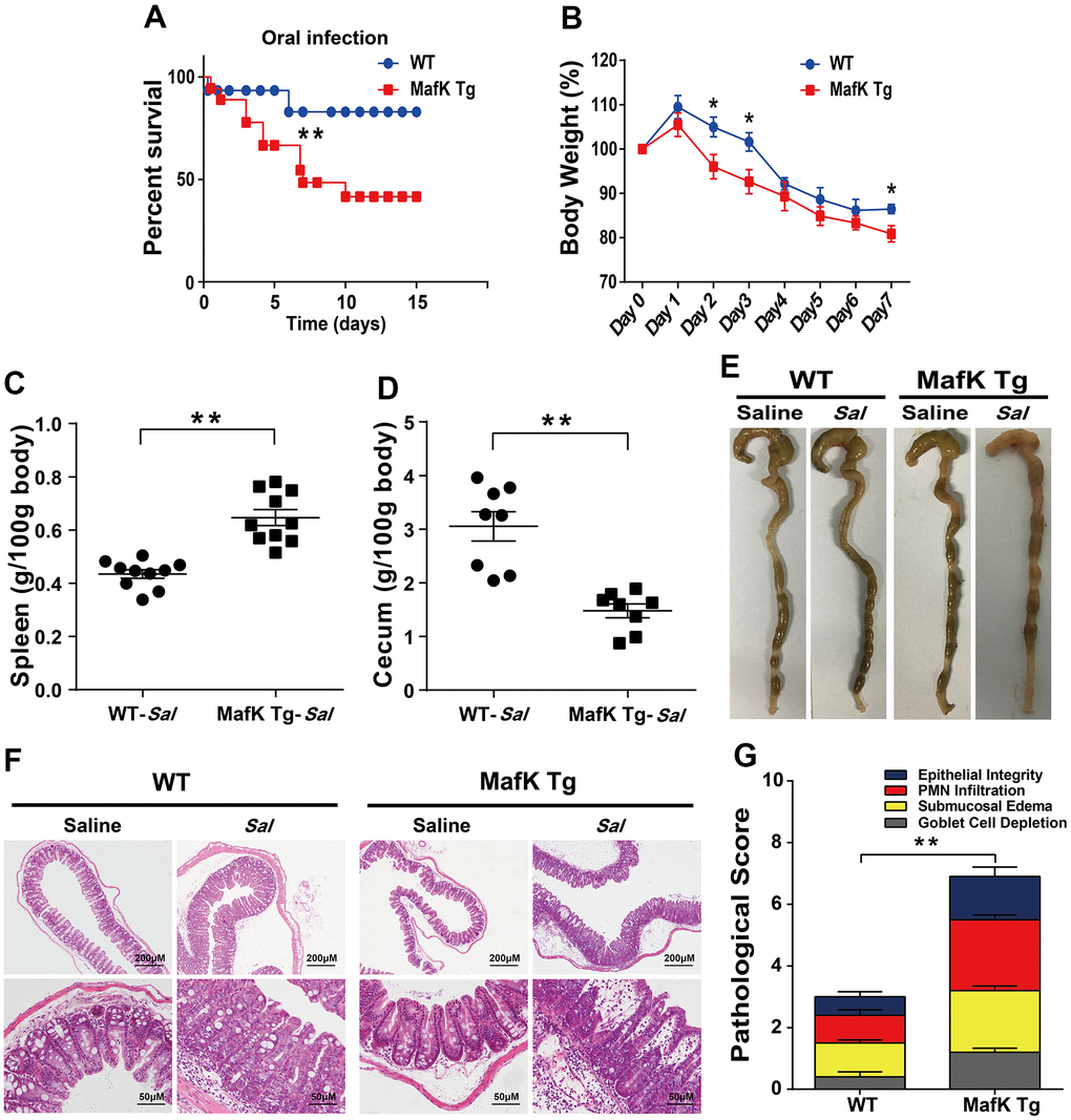 The pathophysiology of IBD is aggravated by the dysregulation of the intestinal immune response. To investigate whether the local immune response could be activate by MafK in the gastrointestinal tract, a dose of 5×107 CFU Salmonella was given orally to the mice. The results showed that MafK has a negative effect on gut homeostasis. MafK Tg mice had increased production of proinflammatory mediators, making them more sensitive to Salmonella mucosal infection and sustained more intestinal damage.