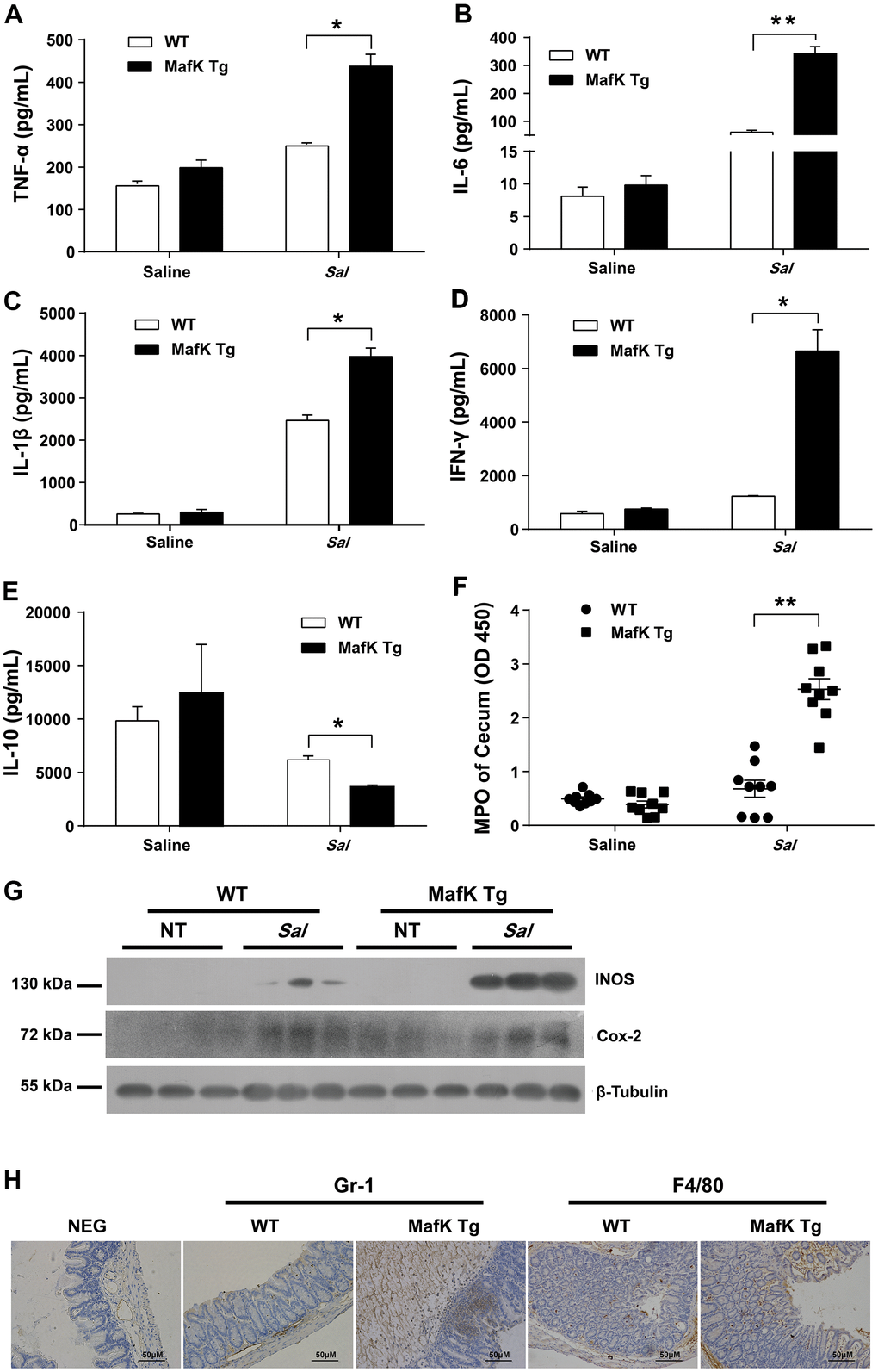 WT and MafK Tg mice were infected with Salmonella for 2 days to explain the involvement of MafK in intestinal colitis limitation by evaluated the production of proinflammatory mediators in the ceca. Compared with WT mice, the cecum of MafK Tg mice contained considerably more proinflammatory cytokines, TNF-α, IL-6, IL-1β, and INF-γ were all included (Figure 2A–2D). TNF-α, IL-6, and INF-γ’s Levels in the serum of MafK Tg mice were all significantly upregulated compared to WT mice following a 2 day infection with Salmonella (Supplementary Figure 1). Comparatively, when compared to WT mice, TNF-α, IL-6, and INF-γ of MafK Tg mice were increased significantly following Salmonella infection for 2 days in the colon (Supplementary Figure 3B–3D). The anti-inflammatory cytokine IL-10 was found to be significantly reduced in MafK Tg mice compared to WT mice (Figure 2E). In addition, neutrophil accumulation was elevated by myeloperoxidase (MPO) activity in MafK Tg mice (Figure 2F). MafK Tg mice had increased levels of the inflammatory enzymes Cox-2 and iNOS, both of which have been linked to colon inflammation and cancer (Figure 2G). Additionally, on Day 2 p.i. MafK Tg and WT mice accumulated neutrophils and macrophages (Figure 2H).