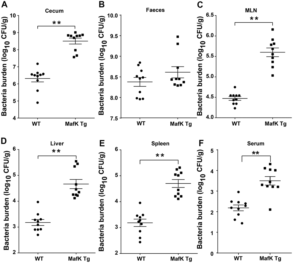 On the basis of the aforementioned findings, we hypothesized that the increased pathology observed in MafK Tg mice after Salmonella infection was caused by greater colonization levels. Salmonella burdens in the cecum and feces of MafK Tg mice were dramatically increased (Figure 3A, 3B), suggesting that MafK promotes Salmonella colonization in the intestinal tract. Moreover, Salmonella levels were significantly increased in MafK Tg mice’s mesenteric lymph nodes (MLNs), liver, spleen, and serum when compared to WT mice (Figure 3C–3F), implying what MafK Tg mice failed to control Salmonella translocation. Thus, these results suggested that MafK was associated with susceptibility to Salmonella mucosal infection, which resulted in quicker Salmonella dissemination.