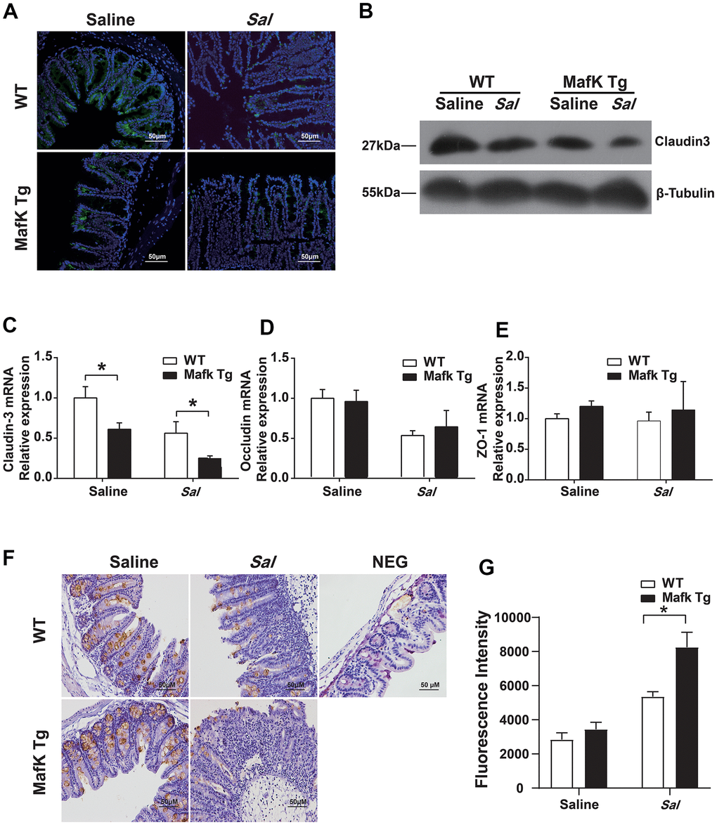 Collectively, these data suggested that the failure of MafK Tg mice to protect against Salmonella infection might result from the fragile tight junction barrier function.