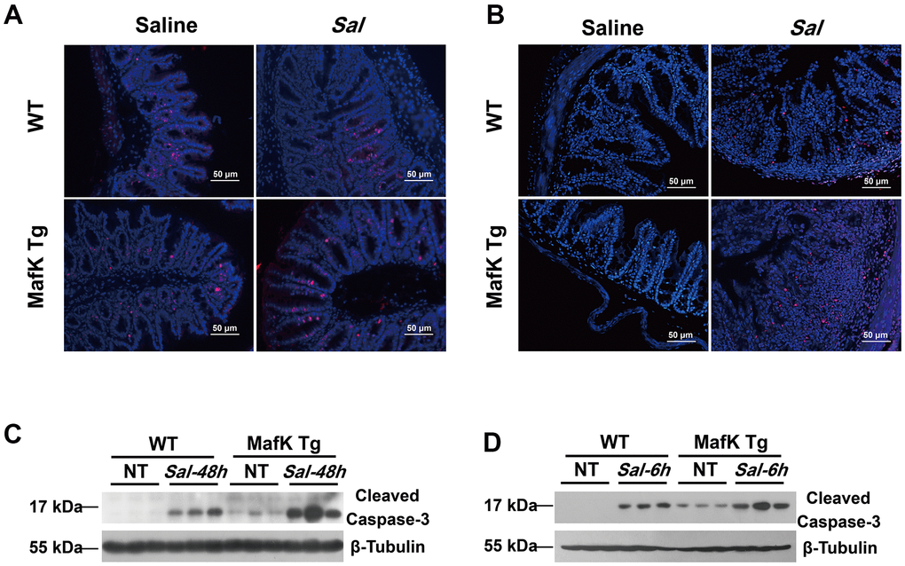 Collectively, these results indicated that MafK could participate in accelerating the invasion of Salmonella pathogenesis in the mouse intestine by increasing caspase-3 activation.
