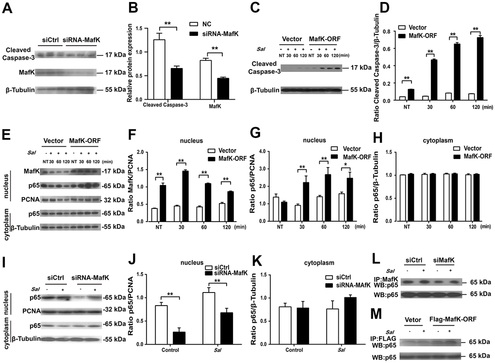 MafK can interact with different mediators to execute different biological functions. Previous reports indicated that MafK mediates p65 acetylation and participates in oxidative stress and inflammation [21]. Furthermore, NF-κB signaling could induce caspase-3-mediated apoptosis in osteoclasts [22]. To determine whether there was a correlation between MafK and p65, the levels of p65 were measured in the nucleus of MafK-overexpressing Caco-2 cells and control cells. In the nucleus, the content of p65 presented similarity between MafK-overexpressing Caco-2 cells and the control cells. In response to the Salmonella infection, the levels of p65 in the nucleus of MafK-overexpressing Caco-2 cells were significant increased than those in control cells. Similarly, the level of MafK also increased gradually when challenged with Salmonella. However, few changes were found in the control cells regardless of the expression of MafK or the nuclear entry of p65. After Salmonella infection in MafK-overexpressing Caco-2 cells and control cells, the levels of p65 in the cytoplasm were not different (Figure 6E–6H). These results indicated that MafK can accelerate the nuclear entry of p65 during Salmonella infection. Additionally, in siRNA MafK Caco-2 cells and control cells, the levels of p65 in the cytoplasm and nucleus were examined. A similar regulation effect was found. The levels of p65 in the nucleus in MafK-silenced Caco-2 cells were reduced compared with those in the control cells, while p65’s content were not affected in the cytoplasm, indicating a promoting effect of MafK on p65 (Figure 6I–6K). The subsequent pull-down study proved that MafK could interact with p65 directly (Figure 6L, 6M). According to these results, MafK might promote cleaved caspase-3 expression through increasing p65 entry nucleus.
