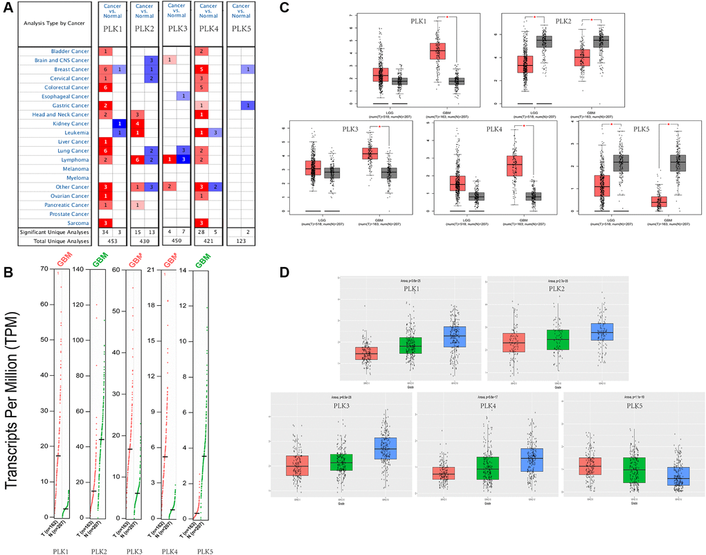 We compared the expression levels of PLKs in cancer with those in non-tumorous samples via the ONCOMINE data resources (Figure 1A). The transcript expression levels of PLK1/3/4 were remarkably elevated in individuals with GBM, and that of PLK2 was remarkably downregulated in patients with GBM. PLK5 expression was not remarkably different between GBM and non-tumorous tissues. All PLK mRNA expression levels were not remarkable in low-grade glioma (LGG) tissues. The fold change and p-values of the PLKs are shown in Table 1. Through the Gene Expression Profiling Interactive Analysis (GEPIA2) cohort, we compared the transcript expression levels of PLKs between GBM and non-tumorous tissues (Figure 1B). The data illustrated that the contents of PLK1/3/4 were higher in GBM tissues than in non-tumorous tissues, whilst the contents of PLK2 and PLK5 were lower in GBM (Figure 1C).