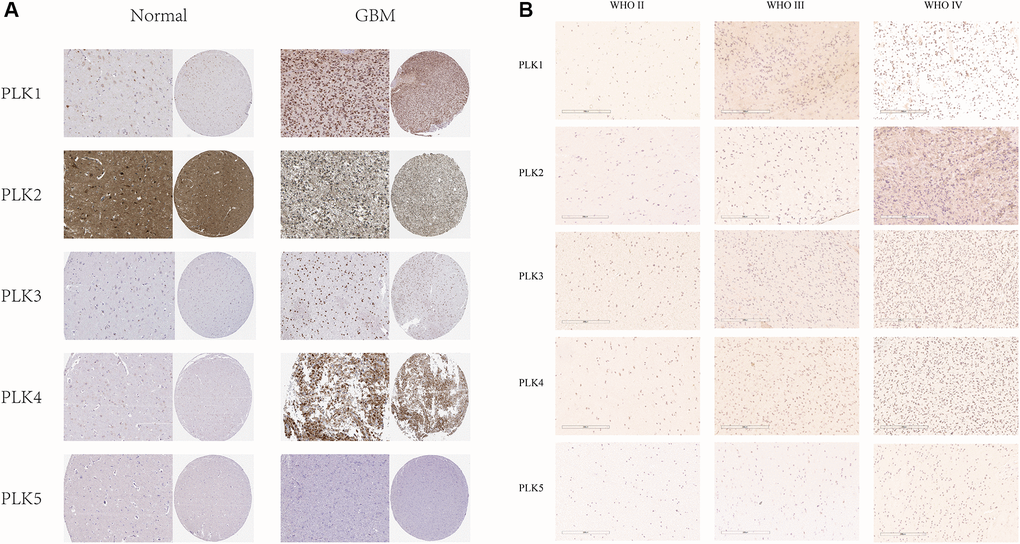 Besides, immuno-histochemistry (IHC) staining abstracted from the Human Protein Atlas (HPA) data resource exhibited the contents of PLKs as shown in Figure 2A. PLK1/3/4 were over-expressed in GBM in contrast with non-tumorous tissues. On the contrary, PLK2 was more highly expressed in non-tumorous tissues than in GBM. PLK5 was expressed in neither GBM nor non-tumorous tissues (Figure 2A). Besides, immuno-histochemistry illustrated that the staining index score of PLK1-4 in AIIs was frequently less than two. In sGBMIVs, the staining index score was frequently more than four (Figure 2B). The data illustrated that the content of PLK1-4 rose in tandem with rising tumor grades, confirming our prediction.