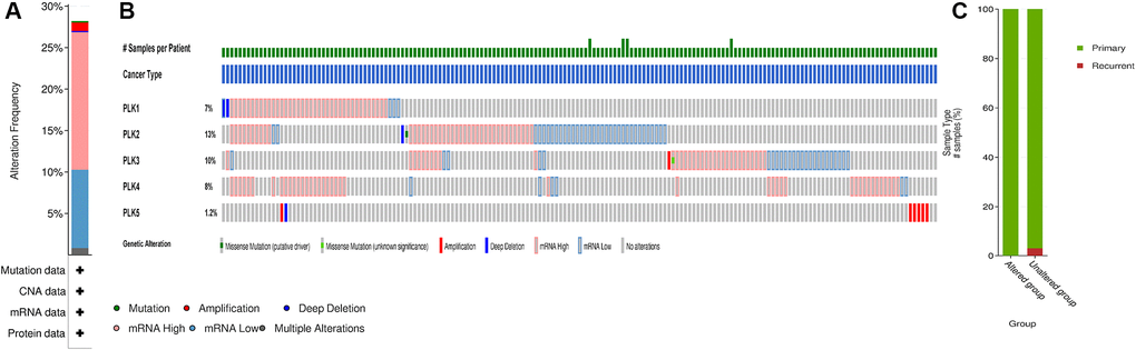 We analyzed the PLK alterations using the cBioPortal online tool for GBM. PLK alterations included the following forms: deep deletion, amplification, mRNA high, and mRNA low. Two or more PLK alterations were seen in 29% of the samples (136 samples) (Figure 3A and 3B). In addition, using the same tool, we found that PLK alterations typically occur in the primary GBM (Figure 3C).