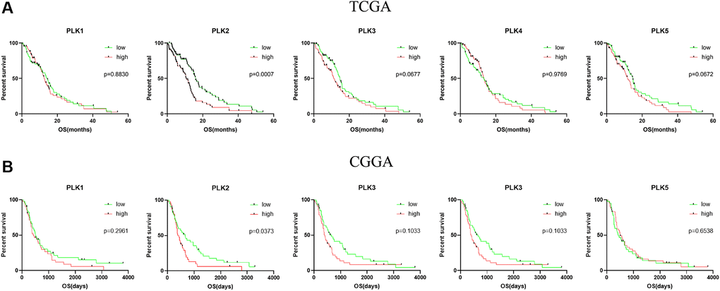 We further assessed the pivotal efficiency of PLKs in the survival of individuals with GBM. Kaplan–Meier Plotter tools were adopted to assess the relationship of PLK transcript contents with the survival of patients with GBM using GraphPad Prism (Figure 4A). The Kaplan-Meier curve along with the log-rank test analyses revealed that the decreased PLK2 expression level was remarkably linked to overall survival (OS) (p < 0.05). The individuals with GBM with high mRNA contents of the PLK2 were predicted to have poor OS. While PLK1/3/4/5 showed no prognostic significance (p > 0.05). This result was also validated in the CGGA data resource (Figure 4B). The high contents of PLK2 were remarkably linked to poor prognosis (p < 0.05). Specifically, we retrieved clinical information from the TCGA data resource, and K-M analysis showed that high PLK2 expression likewise predicted poor patient prognosis (p < 0.05).