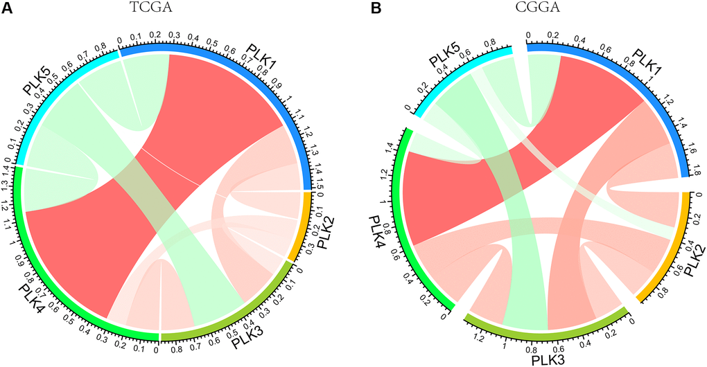 We also computed the correlations among PLKs by analyzing their transcript expression levels via the TCGA and CGGA data resources for GBM, and Pearson’s correction was conducted. The data exhibited remarkable correlations in several PLKs. PLK5 was negatively correlated with PLK1, PLK2, PLK3, and PLK4. A positive relationship was also evident between PLK1 and PLK4 (Figure 5). As shown in Table 3, the analysis of mutual exclusivity between PLKs found that the relationship between PLK1 and PLK4 is characterized by co-occurrence (Table 3).