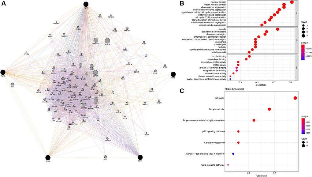 Nuclear division, segregation of mitotic nuclear division chromosome, modulation of mitotic cell cycle phase transition, segregation of nuclear chromosome, organization of mitotic spindle, segregation of chromatid, cell transition of cycle G2/M phase, along with segregation of mitotic sister chromatid are all BPs. The condensed chromosome in the spindle, the spindle pole midbody, the chromosomal region, the condensed chromosome centromeric region, the kinetochore, the condensed chromosome kinetochore, the chromosome centromeric region, and the mitotic spindle are all parts of the condensed chromosome centromeric region. Tubulin docking, microtubule docking, motor activity, protein C-terminus docking, magnesium ion docking, histone kinase activity, histone serine kinase activity, and cyclin-dependent protein kinase activity constituted the MFs. The cell cycle, p53 signaling cascade, oocyte meiosis, progesterone-triggered oocyte maturation, cellular senescence, human T-cell leukemia virus 1 infection, and FoxO signaling cascade were all highly enriched in the PLK network (Figure 6).