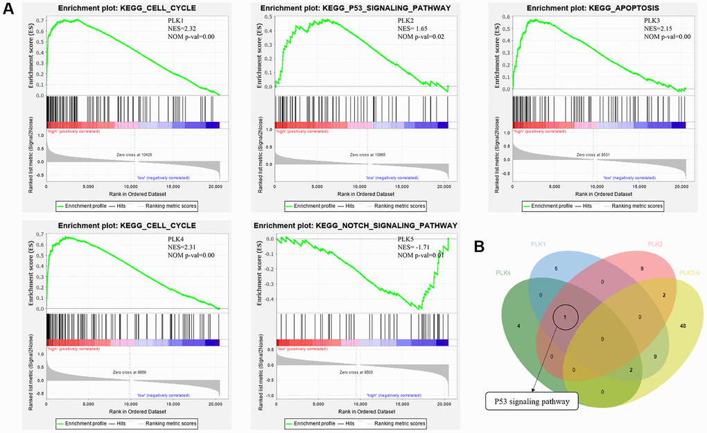 In addition, GSEA (Gene Set Enrichment Analysis) illustrated that the high expression of PLK1 was linked to the cell cycle, the low expression of PLK2 was linked to the NOTCH signaling cascade, the high expression of PLK3 was linked to apoptosis, the high expression of PLK4 was linked with the cell cycle, and the low expression of PLK5 was linked to the NOTCH signaling cascade (Figure 7A). Finally, p53 signaling cascade was found to play a key role by overlapping KEGG cascades between PLKs’ network and GSEA’s results (Figure 7B).