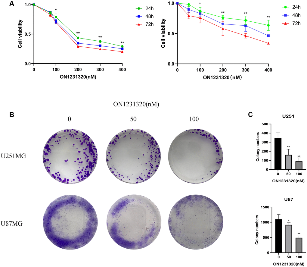 We found for the first time that ON1231320 dampened the growth of human glioma cells. The Cell Counting Kit-8 (CCK-8) assay was done after inoculating U251MG and U87MG cells with the specified levels of ON1231320 for 24, 48 and 72 h, respectively. The data illustrated that inoculation with 200 nm ON1231320 caused remarkable glioma cell growth dampening at 24, 48 h and 72 h (Figure 8A). The colony generation of U251MG and U87MG cells after 100 nM ON1231320 inoculation was remarkably lower in contrast with the controls, and the colony generation of glioma cells diminished with increasing ON1231320 levels (Figure 8B and 8C). The data illustrated that ON1231320 remarkably dampened the growth of glioma cells in a time- along with dose-dependent approach.