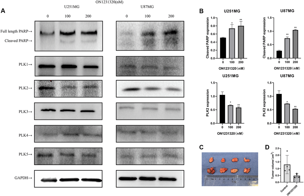 We carried out western blot assays to further demonstrate the manner in which ON1231320 enhances apoptosis in glioma cells. The data illustrated that the expression of cleaved PARP was elevated and the content of PLK2 was decreased in U251 and U87MG cells after ON1231320 treatment (Figure 9A and 9B). While the expression of PLK1/3/4/5 was not changed. Meanwhile ON1231320 promoted cleaved PARP expression and dampened the expression of PLK2 in a dose-dependent approach. These data suggest that ON1231320 shows its antitumor properties in glioma cells.