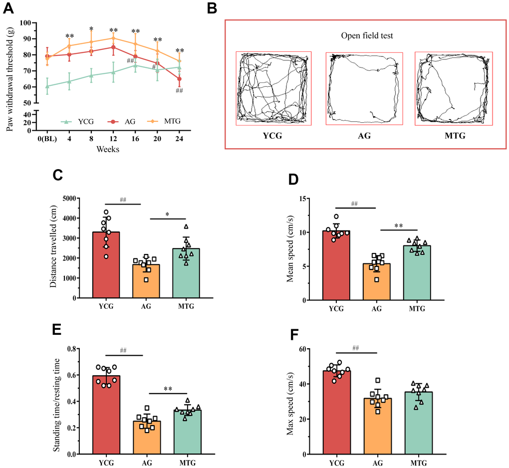 Behavioral tests were conducted for 6 months during the light cycle between 9 am and 5 pm. The rats were habituated to the experimental environment for 2 h daily 3 days before testing. The mechanical hyperalgesia test was performed on the rats every month, once a day for 3 consecutive days, and the mean results of the 3 tests were taken as the final behavioral test results of the month. The open field test was performed after the 6-month intervention, repeated tests and data processing method was the same as above. The tests were implemented, recorded and supervised by 3 experimenters, respectively, and rotated after each test to reduce the experimental error as much as possible.