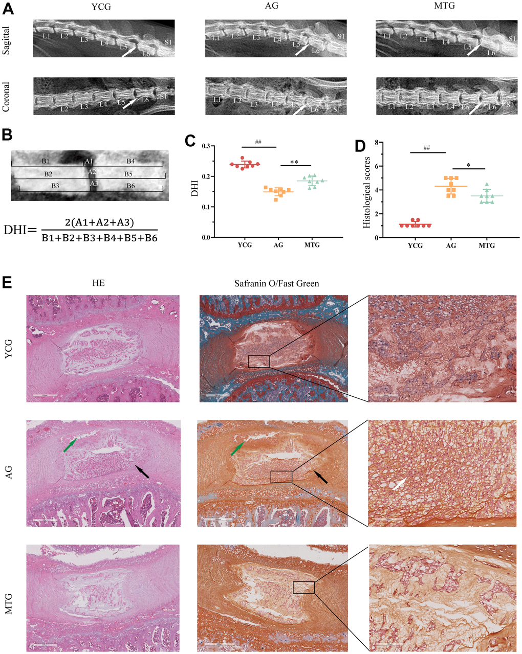 To intuitively evaluate the age-related changes in the lumbar IVD, we took radiographs of the rats’ lumbar spine in the coronal and sagittal planes (Figure 2A). The X-ray images indicated that the IVDs of the AG were characterized by height loss and blurring of the CEP boundary, which can be quantified by calculating the disc height index (DHI) (Figure 2B). Compared with the 6-month-old rat lumbar IVDs, the 18-month-old lumbar IVDs showed a significant reduction in DHI (P < 0.01), indicating that MT can significantly increase the DHI of aging rats (P < 0.01) (Figure 2C).