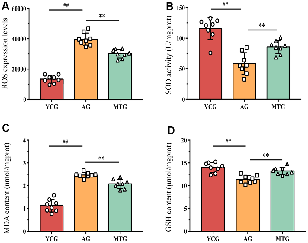 To assess the effects of MT on the oxidative balance of IVDs, we measured ROS levels, superoxide dismutase (SOD) activity, and the malondialdehyde (MDA) and glutathione (GSH) content. The ROS expression levels in the NP tissues of the aging rats were significantly higher than those of the young rats (P < 0.01), suggesting that aging can cause more oxidative stress damage to tissues (Figure 3). As the product of lipid peroxidation, the MDA content of the aging rats was also significantly higher than that of the young rats (P < 0.01). In contrast, SOD and GSH are important antioxidant enzymes for countering the overproduction of active free radicals. However, the SOD activity of the NP in the AG was significantly lower than (almost half) that in the YCG (58.06 ± 17.86 vs. 115.71 ± 18.20; P < 0.01). Although the GSH content did not decrease substantially (11.38 ± 0.86 vs. 13.99 ± 1.07), the difference was statistically significant (P < 0.01). The results indicated that aging decreased IVD antioxidant capacity, disrupting the original redox balance.