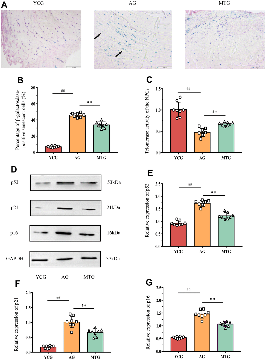 To observe the degenerative disc phenotypes, the tissue sections were stained with hematoxylin and eosin and Safranin O/Fast Green. The results showed that the young control group (YCG) had healthy discs (Figure 2E), characterized by normal cellularity with a mix of large, vacuolated (notochordal) cells in the NP, and clear demarcation between NP and AF tissues with an intact and tightly arranged structure. On the other hand, the discs of the AG revealed severe degenerative phenotypes, including cell arrangement disorders, pronounced cell loss, and the presence of non-vacuolated cells (Figure 2E, white arrow). The clear distinction between the NP and AF tissue compartments was lost, and some of the inner AF layers showed inward buckling (black arrow). Tissue demarcation between the NP and CEP was indistinct and showed partial necrosis (green arrow). Similarly, the junction between the AF and NP was blurred in the discs of the MTG due to aging. Compared with the AG, however, the rats that underwent MT had improved degenerative disc phenotypes, including cell loss, altered cell distribution and morphology, thus maintaining IVD function. The histological scores revealed (Figure 2D) that the IVD scores of the AG were significantly higher than those of the YCG (P < 0.01), while the scores for the MTG were significantly lower than those of the AG (P < 0.05).