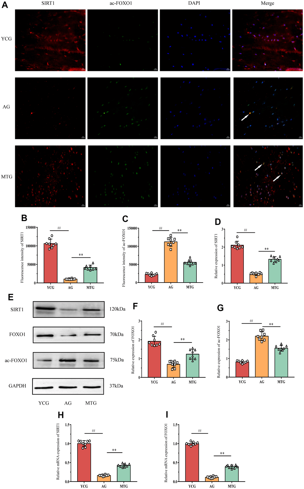 The western blot analysis (Figure 5E) also showed changes in the SIRT1, FOXO, and ac-FOXO1 proteins in the pathway. The results for SIRT1 and ac-FOXO1 were consistent with those of the immunofluorescence (Figure 5D, 5G). Compared with the YCG, the AG had significantly decreased FOXO1 expression in the NPCs (P < 0.01), which might have been caused by acetylation of a large amount of FOXO1, and MT might indirectly increase FOXO1 expression by inhibiting acetylation (P < 0.01). In addition, the PCR results for SIRT1 and FOXO1 further confirmed the above results (Figure 5H, 5I). Thus, MT might exert its effects by regulating the SIRT1/FOXO1 pathway.