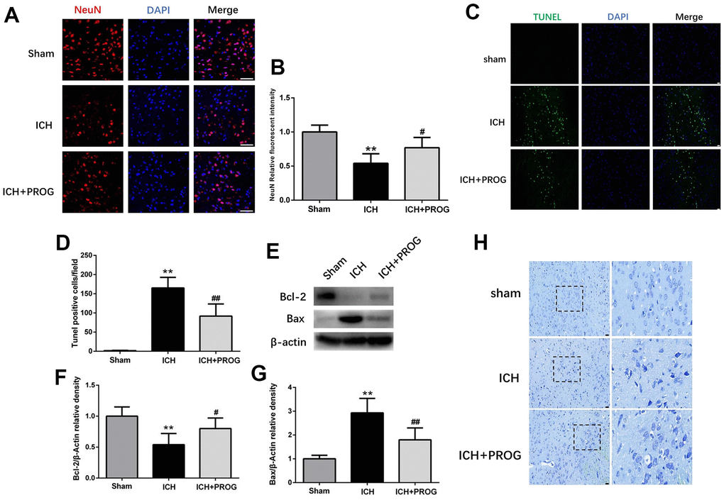We investigated whether progesterone reduces neuronal death and apoptosis after ICH. Immunofluorescence analysis showed that neuronal nuclear protein (NeuN)-positive cells decreased after ICH and increased after progesterone treatment (P < 0.05; Figure 2A, 2B). Furthermore, the number of terminal deoxynucleotidyl transferase dUTP nick end labeling (TUNEL)-positive cells increased in the ICH group and decreased with progesterone treatment (P < 0.05; Figure 2C, 2D). In addition, progesterone treatment decreased the expression levels of BCL2 Associated X (Bax) and increased B-cell lymphoma 2 (Bcl-2) apoptosis regulator (P < 0.05; Figure 2E–2G). The results of Nissl staining showed that ICH potentially reduced the number of surviving neurons compared to the sham group, and progesterone treatment alleviated the neuronal injury (Figure 2H). These results suggest that progesterone can alleviate neuronal death and apoptosis after ICH.