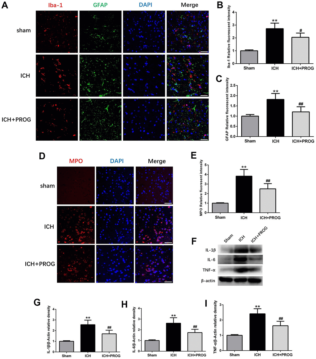 The fluorescence intensity of the glial fibrillary acidic protein (GFAP) and ionized calcium-binding adaptor molecule 1 (Iba1) after ICH was higher than in the sham group; this effect was reversed with progesterone treatment (P < 0.05; Figure 3A–3C). Similar to previous studies, we found that myeloperoxidase (MPO) increased in the ICH group compared with the sham group and was reduced by progesterone treatment (P < 0.05; Figure 3D, 3E). In addition, we measured the expression levels of inflammatory cytokines, including interleukin (IL)-1β, IL-6, and tumor necrosis factor-alpha (TNF-α) after ICH and investigated whether progesterone intervention affected inflammation. We found that compared with the sham group, the expression of IL-1β, IL-6, and TNF-α in the ICH group was higher. However, progesterone treatment reduced the expression of inflammatory cytokines compared with the ICH group (P < 0.01; Figure 3F–3I).
