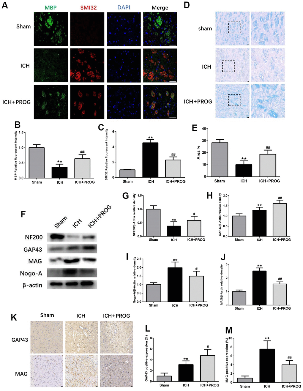Immunofluorescence staining for the myelin basic protein (MBP) and anti-neurofilament-h non-phosphorylated mouse antibody (SMI32) was performed to elucidate further the effects of progesterone on myelin loss and axonal pathology. Compared with the sham group, the MBP fluorescence intensity decreased and SMI32 increased in the ICH group, and these effects were reversed by progesterone treatment (P < 0.05; Figure 4A–4C). Luxol fast blue (LFB) was used to label normal myelin to examine the loss of this substance on day three after ICH. The results showed that progesterone treatment reduced the loss of myelin compared with the ICH group (P < 0.05; Figure 4D, 4E). Next, we examined the expression of the axonal growth factors GAP43, NF200, and the myelin inhibitors myelin-associated glycoprotein (MAG) and neurite outgrowth inhibitor (Nogo)-A. The results showed that the expression of NF200 decreased compared with the sham group, while GAP43, Nogo-A, and MAG increased in the ICH group; progesterone treatment reversed these effects (P < 0.05; Figure 4F–4J). Immunohistochemistry results further confirmed that progesterone could increase the expression of GAP43 and decrease MAG (P < 0.05; Figure 4K–4M) after ICH.