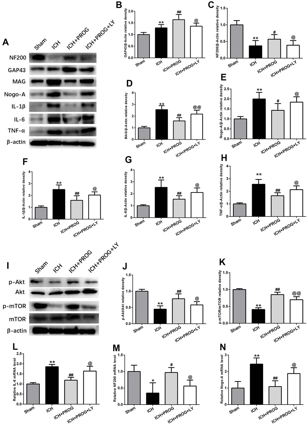 A group of mice was additionally treated with the PI3K inhibitor LY294002 to elucidate the mechanisms of the neuroprotective effects of progesterone on inflammation and the promotion of axonal regeneration. This molecule downregulated NF200 and GAP43 and upregulated Nogo-A, MAG, IL-1β, IL-6, and TNF-α, compared to the that observed with progesterone treatment (P < 0.05; Figure 5A–5H). Similar to the results of previous studies, the PI3K/AKT/mTOR signaling pathway proteins phosphorylated AKT (p-AKT) and phosphorylated mTOR (p-mTOR) decreased after ICH. At the same time, we found that p-AKT and p-mTOR expression increased after treatment with progesterone compared with the ICH group, and this effect was blocked by LY294002 administration (P < 0.05; Figure 5I–5K). In addition, markers of inflammation and axon regeneration were detected by reverse transcription-polymerase chain reaction (RT-PCR), and similar results were obtained as before (P < 0.05; Figure 5L–5N).