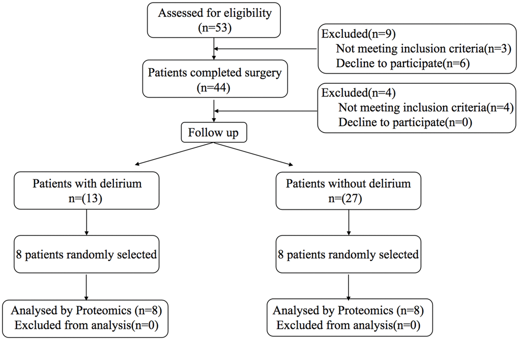 A total of 53 patients were initially enrolled in the study, and 40 patients completed the study with 13 patients developing POD. Peripheral blood and preoperative cerebrospinal fluid from eight patients with delirium and eight patients without delirium were selected for relevant testing and validation. The characteristics are shown in Table 1.