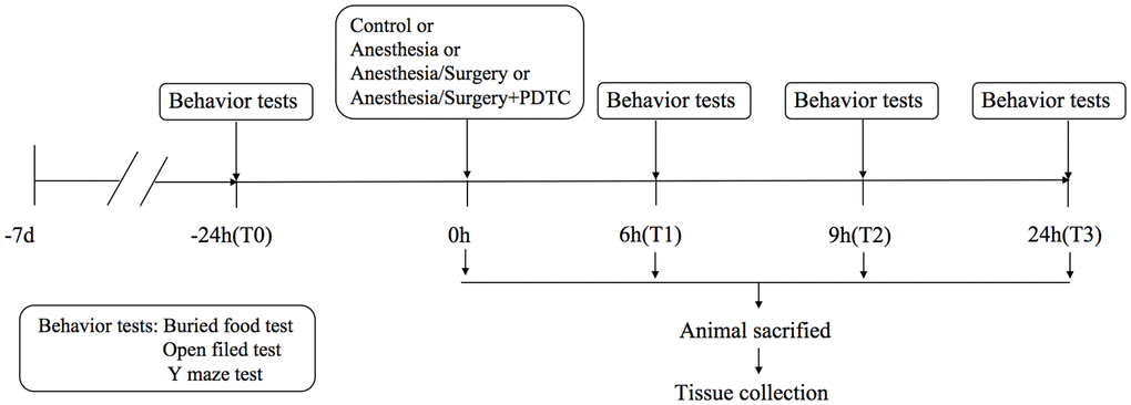 The mice were randomly divided into four groups (n=6 in each group) using a random number table: control group (Group C), anesthesia-only group (Group A), anesthesia-surgery group (group AS), and AS+PDTC group (group ASP). Mice in Group C were placed in an induction box containing desiccant and carbon dioxide adsorbent to inhale 100% oxygen and did not receive anesthesia and surgical treatment; mice in Group A received 1.4% isoflurane (Lot number: 20010601, Reward Life Technology Co.Ltd., China) (100% oxygen) anesthesia treatment for 2 h; mice in group AS underwent surgery under 1.4% isoflurane (100% oxygen) anesthesia; mice in ASP group were intraperitoneally injected with 50 mg/kg PDTC (Lot number: BCCF3413, Sigma-Aldrich, USA) 30 min before and 2 h after surgery, and other protocols were the same as those in AS group.